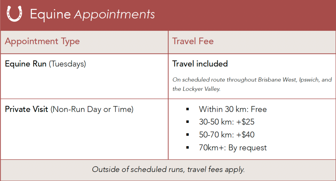 We offer mobile visits throughout the Lockyer Valley, Ipswich, Lower Somerset and Brisbane West regions, with travel fees based on distance from our service base in Lockrose. Travel fees are applied per property, not per patient — so you’re only charged once per visit, regardless of how many patients are treated.
